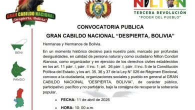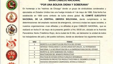 La Paz, 17 de abril de 2026.- La Central Obrera Boliviana (COB) convocó este viernes a un “Gran Cabildo Nacional” para el 1 de mayo en la ciudad de El Alto, en repudio al Gobierno de Rodrigo Paz, al que acusa de privatizar los recursos estratégicos, vulnerar la Constitución Política del Estado y desproteger el salario de los trabajadores. La movilización, que se enmarca en el Día Internacional del Trabajador, incluye un pliego de once…