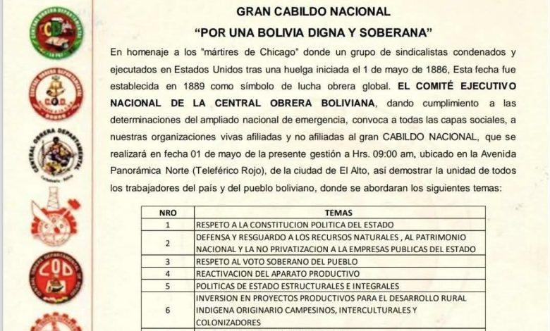 La COB convoca a un Cabildo este 1 de mayo con once puntos contra el modelo “ entreguista” del gobierno de Paz