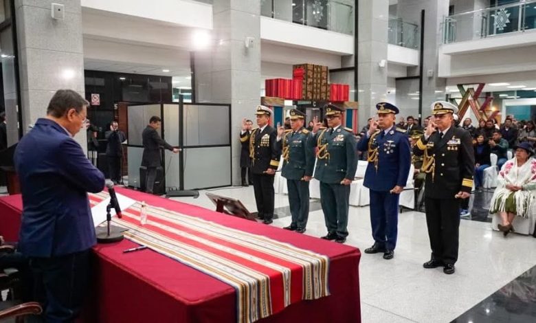 14 de agosto 2025 .- A 48 horas de las elecciones El presidente y capital general de las FFAA, Luis Arce posesionó este jueves al nuevo Alto Mando interino de las Fuerzas Armadas, colocando al contraalmirante Gustavo Primitivo Aníbarro como comandante en jefe. El acto se realizó a solo dos días de las elecciones, en la Casa Grande del Pueblo.