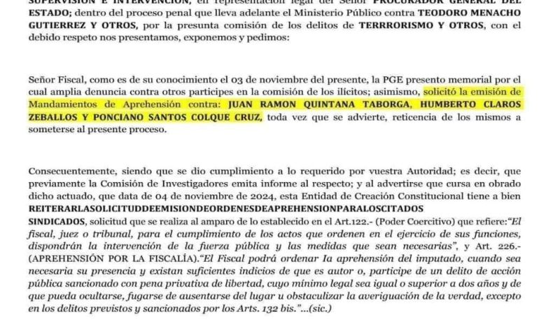 “Señor Fiscal, como es de su conocimiento el 03 de noviembre del presente, la PGE presentó memorial por el cual amplia denuncia contra otros participes en la comisión de los ilícitos; asimismo, solicitó la emisión de Mandamientos de Aprehensión contra: Juan Ramón Quintana Taborga, Humberto Claros Zeballos y Ponciano Santos Colque Cruz, toda vez que se advierte, reticencia de los mismos a someterse al presente proceso”, se lee en el documento.