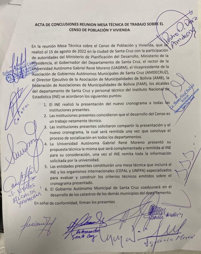 Para tal efecto y como muestra de apertura del avance de diálogo el Gobierno y las principales Instituciónes firmaron un acta de conclusiones de la maratónica reunión que se llevó en Santa Cruz de la Sierra.