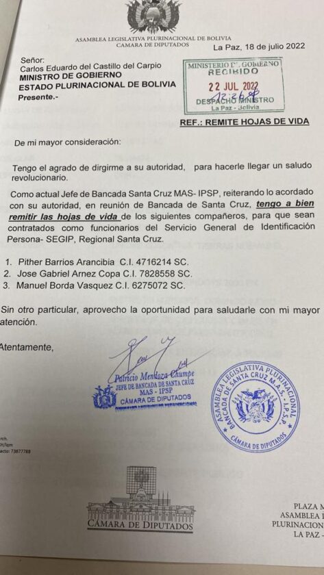Martes 18 de octubre 2022.- Según está nota que accedió Sinmordazadigital, el Diputado Patricio Mendoza, Jefe de la Bancada de Santa Cruz del MAS -IPSP, de la Camara de Diputados, solicitó la contratación como funciónarios del SEGIP , a tres personas entre los que figura José Gabriel Arnéz Copa, que de acuerdo a los antecedentes participó de la campaña de la agrupación política «Juntos».