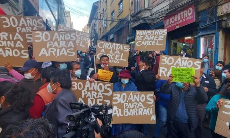 La Paz, 6 de junio 2022.- Un solo pedido se deja escuchar en puertas de los Juzgados por parte de cientos de ciudadadanos que se movilizaron esperando la sentencia contra Jeanine Añez, por el denominado caso golpe de estado II , » Justicia 30 años de Cárcel», la fiscalia sin embargo anunció que solicitará 15 años de pena contra la ex Presidenta Defacto..