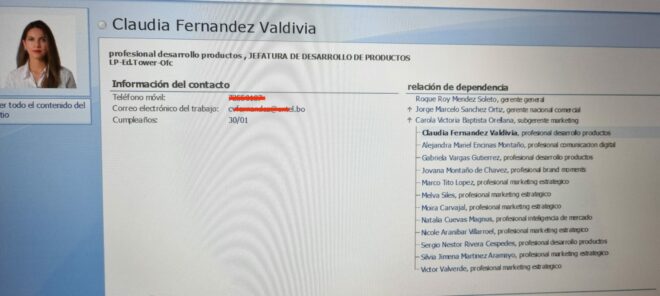 Viernes 9 de septiembre 2022.- A quien responde ENTEL , lo cierto es que Claudia Fernández esposa del ex Vicepresidente Álvaro García Linera, aparece en las planillas como alta funcionaria de la principal Empresa estatal de comunicaciones ella depende directamente del Gerente General Roy Mendez, ocupa el cargo de profesional de Jefatura de Productos y solo figuraría en ese puesto y ganaría sobre los Bs 20 000 sin trabajar como lo haría normalmente cualquier ciudadano.