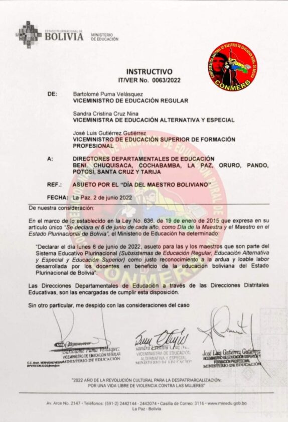 Domingo 5 de junio 2022 .- Este 6 de junio se celebra en Bolivia el Día del Maestro, para este gestión 2022 se declara la jornada como Asueto con suspensión de labores escolares .