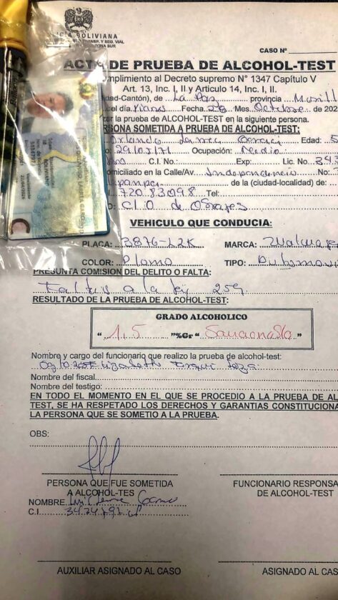 Viernes 28 de octubre 2022.- Según el reporte policial de la Dirección de Tránsito de la zona Sur de la ciudad de La Paz , está madrugada fue detenido conduciendo en estado de ebriedad el Presidente del Colegio Médico de Bolivia, Luis Larrea , el irresponsable conductor amenazó a los policías no brindarles atención médica en los hospitales .