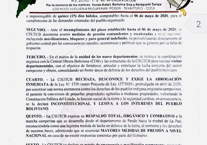 27 de abril 2026.- La Confederación Sindical Única de Trabajadores Campesinos de Bolivia se declaró en estado de emergencia nacional y movilización permanente, otorgando un plazo de 15 días hábiles —hasta el 6 de mayo de 2026— para que el Gobierno atienda las demandas del sector. La decisión advierte con la escalada de medidas de presión, incluyendo bloqueos y un paro general indefinido, en caso de incumplimiento.
