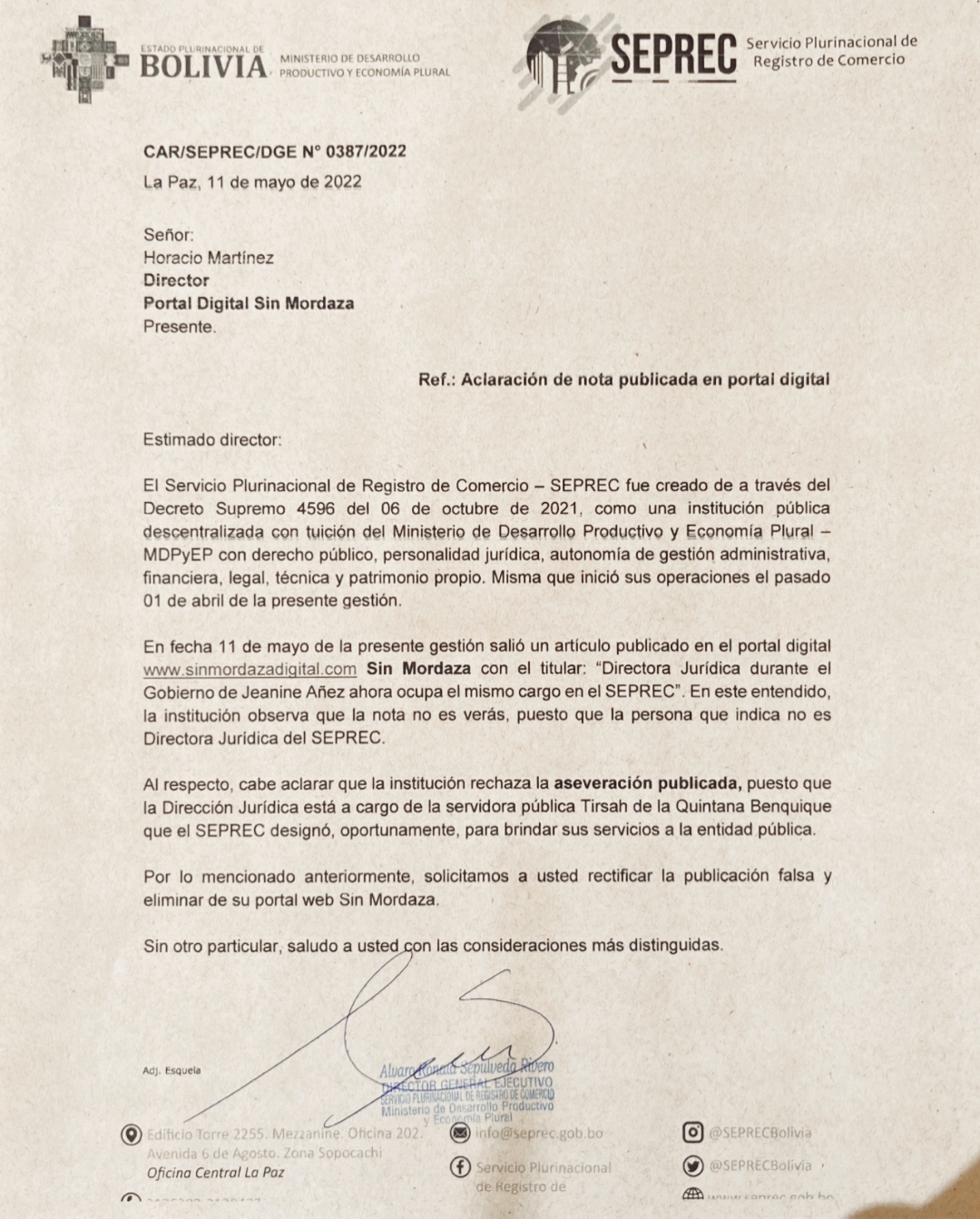 Luego de la publicación en Sinmordazadigital desde el SEPREC, desmienten que la señora Alandia Carvajal, sea la Directora Jurídica de esta nueva institucion y califican de información errónea e información falsa que está generando el periodista Horarcio Martínez.