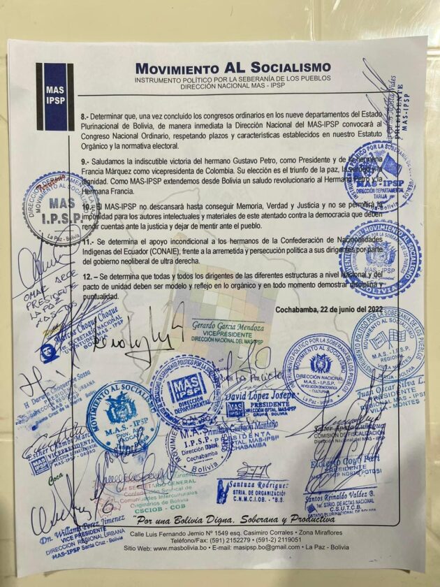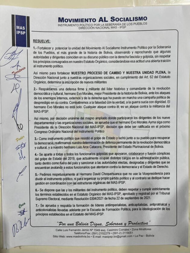 Cochabamba 22 de junio 2022.- El Ampliado Extraordinario del MAS -IPSP, que se realizó en Cochabamba de forma categoríca a respaldado el Liderazgo de Evo Morales , y que será el único Presidente de este Partido Político además el encuentro a cuestionado al Vicepresidente David Choquehuanca, y le están pidiendo que no utilicé la Vicepresidencia para conformar una nueva agrupación política.