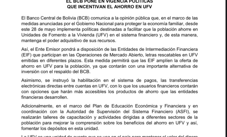ahorro en UFV para la población, ya que contarán con una importante alternativa de