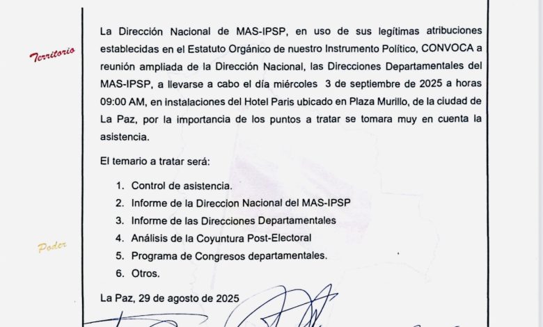 02 de septiembre 2025 .- Después de dos semanas la Dirección Nacional del MAS-IPSP , convoca a una reunión ampliada con las direcciones Departamentales, a llevarse a cabo este miércoles 3 de septiembre , en la ciudad de La Paz .