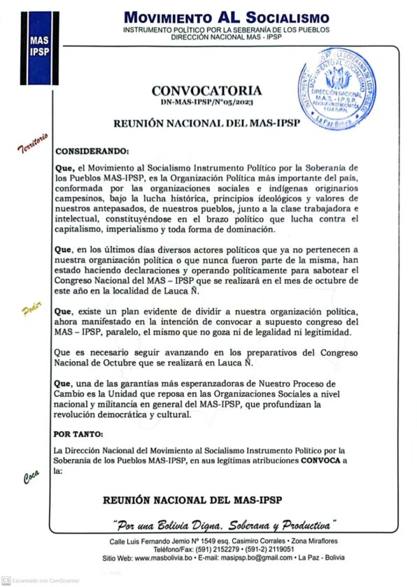 01 agosto 2023 SMD .-La Convocatoria a una reunión de la Dirección Nacional del MAS -IPSP, es para este viernes 04 de agosto , en Cochabamba, dónde asistentes analizarán temas relacionados al Congreso en LaucaÑ, de los participantes es el Comité Ejecutivo de este partido y sus 10 direcciones departamentales, al encuentro no están citados el Pacto de Unidad , que aglutina a las organizaciones sociales.