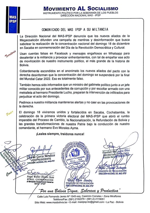 miercoles 14 de diciembre 2022..- Mediante un comunicado la Dirección Nacional del MAS-IPSP, hace conocer a la militancia que por la final del mundial de fútbol entre Argentina y Francia previsto para este domingo 18 de diciembre, haya quedado suspendido el acto de conmemoración por el Día de la revolución democrática, como habría trascendido en redes sociales para desinformar a la gente.