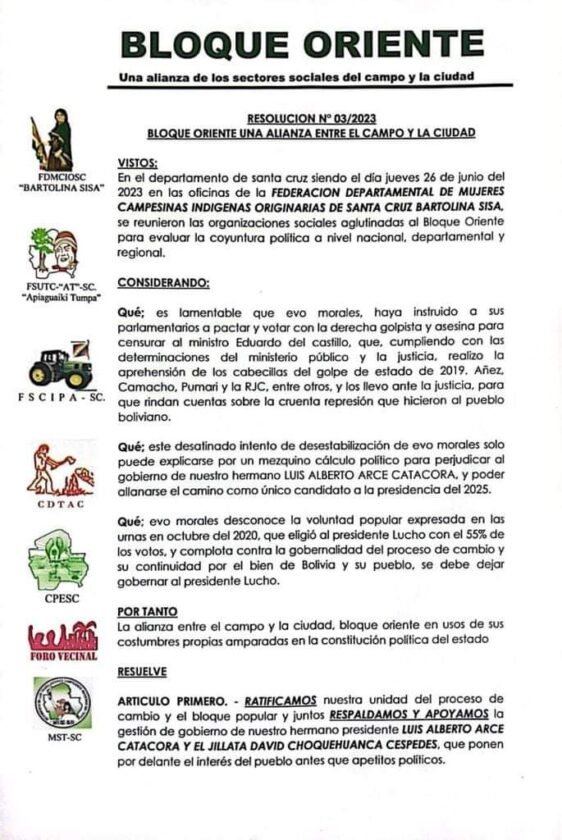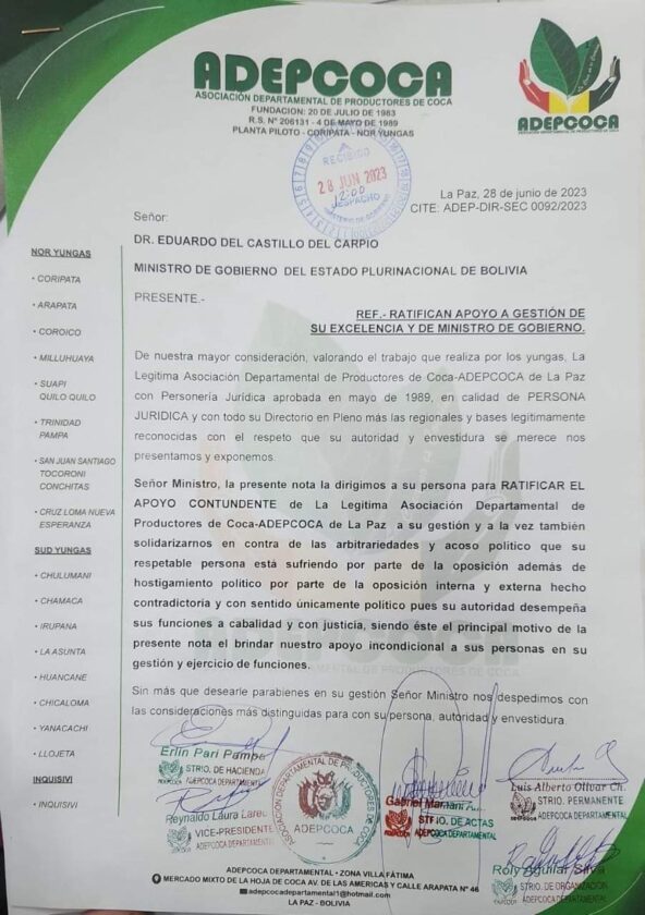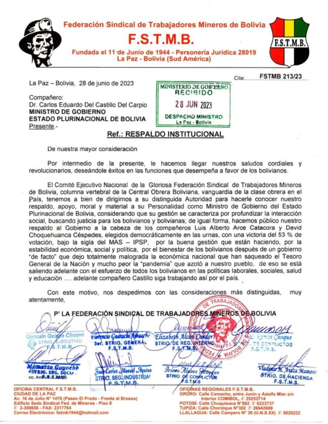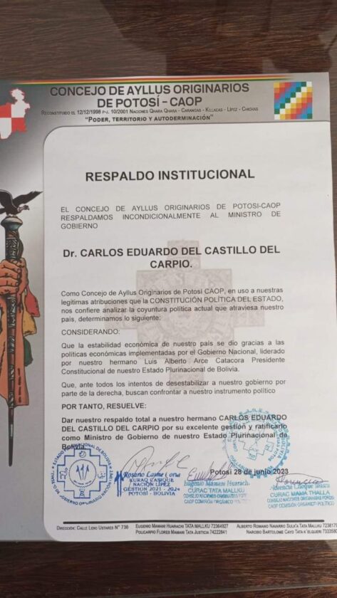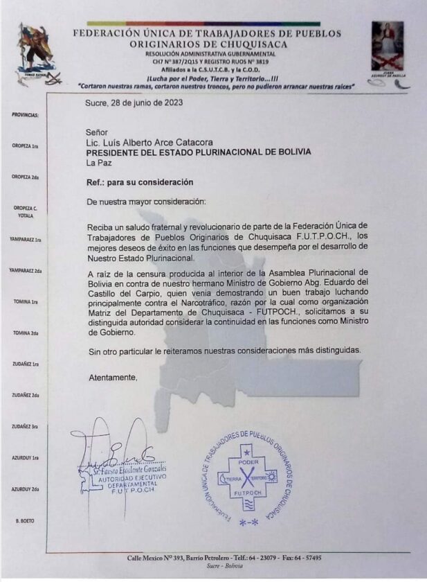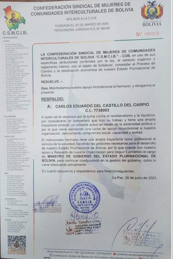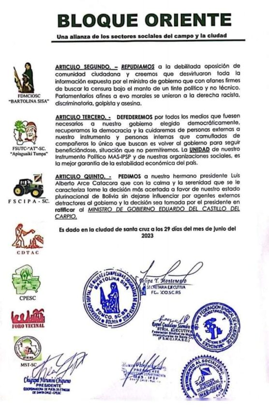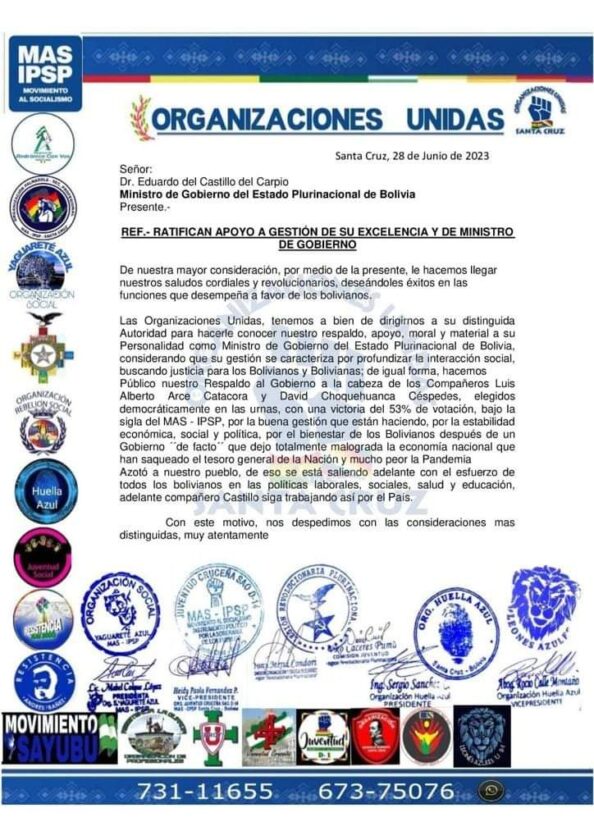 Sin Mordaza digital 28 de junio 2023.- El Ministro de Gobierno Eduardo del Castillo, agradeció el respaldo de las organizaciones sociales que son los verdaderos dueños del llamado proceso de cambio.