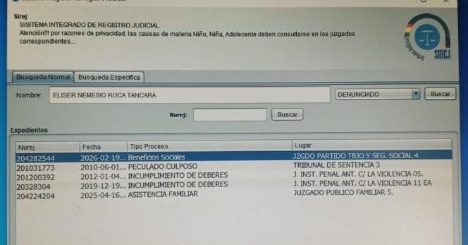 Roca Tancara enfrenta causas que abarcan desde el ámbito laboral y familiar hasta acusaciones penales por presuntas irregularidades en el ejercicio de la función pública. El rastreo en la plataforma oficial del SIREJ, cruzado con documentación judicial, permitió identificar los siguientes casos: