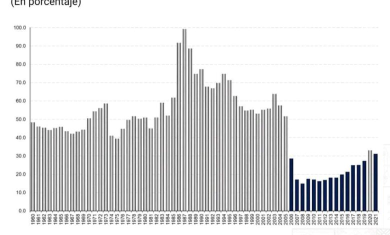 Viernes 26 de agosto 2022.- Entre 2006 y 2021, el ratio de la deuda externa de Bolivia con relación al Producto Interno Bruto (PIB) osciló entre los porcentajes más bajos de la historia (desde 1960); es más, previo a 2006, este ratio se posicionaba en 57% del PIB, en promedio, incluso, se acercó al 100% a finales de la década de los 80’s. Al cierre de 2021, el ratio de la deuda externa boliviana con relación al PIB llega al 31,2%.