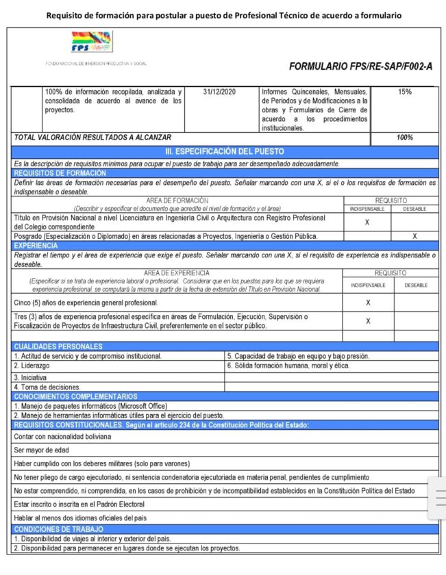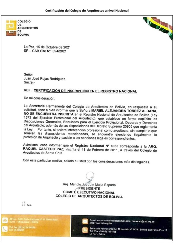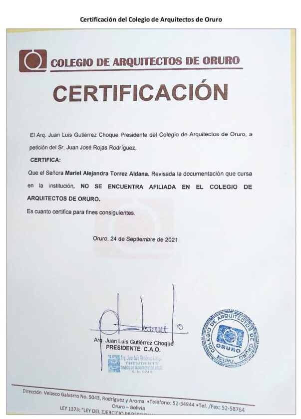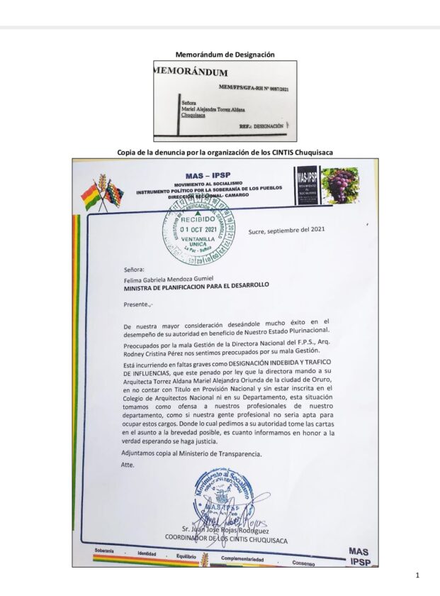 Martes 7 de junio 2022.- Denuncian por omisión , designación ilegal y Tráfico de Influencias a la Directora General Ejecutiva del Fondo Nacional de Inversión Productiva y Social , Rodney Pérez Choque, quien designó de manera indebida a Mariel Alejandra Torres Aldana, como profesional técnico , sin contar con título académico firma como arquitecta, la mencionada habría falsificado el registro o número profesional de otra persona .