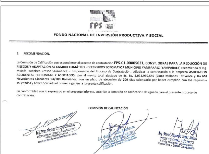 Sinmordazadigital accedió a un contrato de obras para la reducción de riesgos y adaptación al cambió climático en el Municipio de Yamparaez Chuquisaca por un costo de 6 .891.316 de bolivianos, dónde firma como arquitecta Torres Aldana.