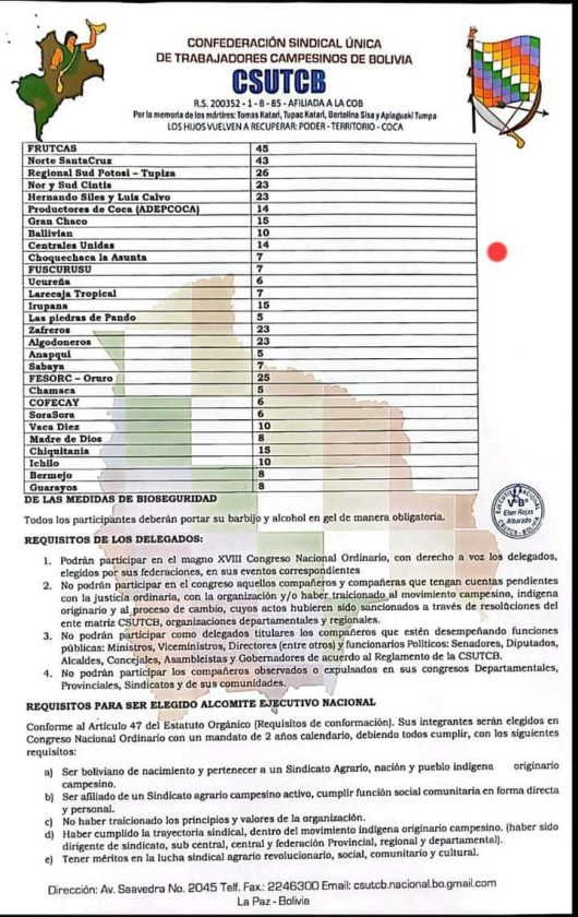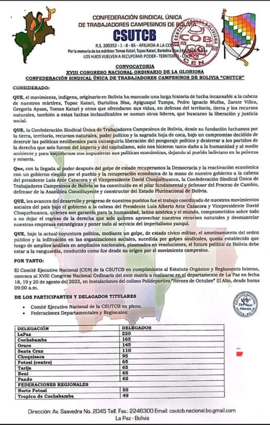 redacción Central 16 de agosto 2023.- Más de mil delegados con voz y voto participaran desde este 18 al 20 de agosto del XVIII Congreso Ordinario de la Confederación Sindical Única de Trabajadores Campesinos de Bolivia (CSUTCB), donde se tomará una posesión política y orgánica sobre la coyuntura política además se elegirá al nuevo Comité Ejecutivo para la gestión 2023 – 2025.