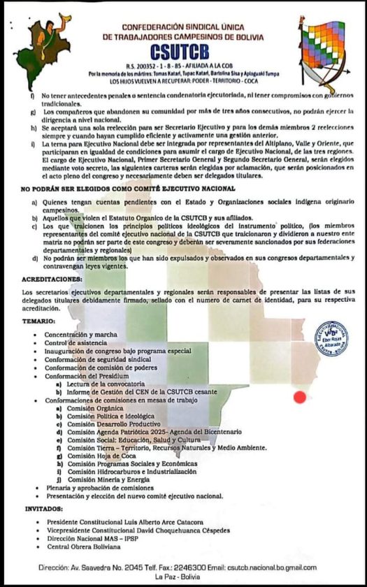 La inauguración está previsto para este viernes 18 de agosto en el coliseo héroes de octubre de la ciudad de El Alto, y fue invitado para iniciar este magno Congreso el Presidente Luis Arce Catacora y Vicepresidente David Choquehuanca.