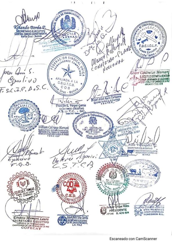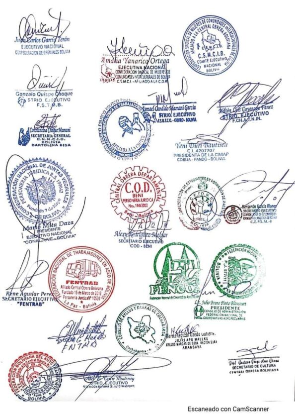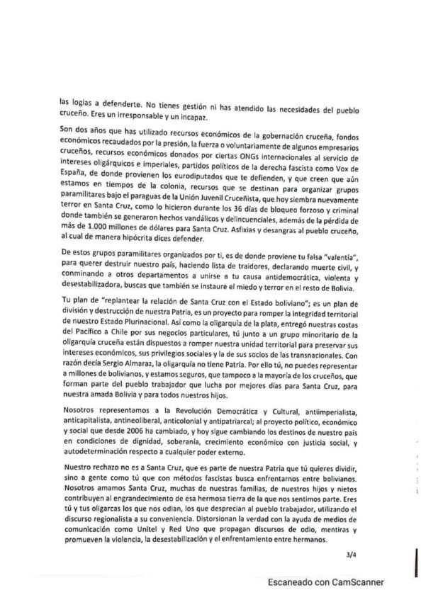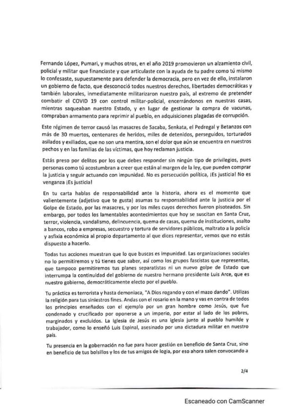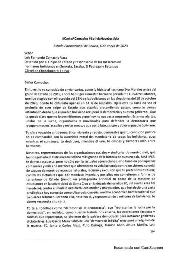 sinmordaza digital 07 de enero 2023 .- Las organizaciones sociales y sindicales de la Central Obrera Boliviana COB y el Pacto Unidad, mediante una carta le recuerdan a Luis Fernando Camacho su participación en las masacres de Sacaba, Senkata, Pedregal y Betanzos, en las más de 30 personas que perdieron la vida, centenares de heridos, miles de detenidos, torturados, perseguidos, asilados y exiliados durante el golpe de Estado de 2019. le recuerdan que es justicia y no venganza.