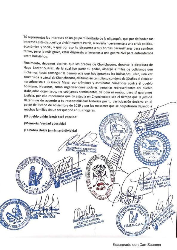 Organizaciones Sociales envian carta a Camacho para recordarle su responsabilidad en las muertes de Sacaba y Senkata