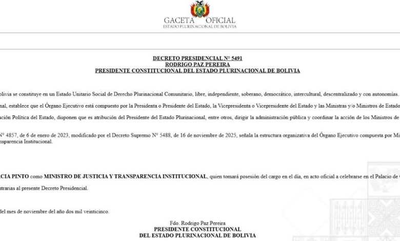 20 de noviembre 2025 .- El presidente Rodrigo Paz emitió el Decreto Supremo 5491 que destituye a Freddy Vidovic y nombra a José García Pinto como nuevo ministro de Justicia y transparencia institucional
