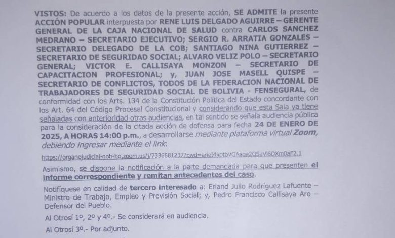 27 de enero 2025 .- El Gerente de la caja nacional de salud René Delgado , ganó una acción popular contra los trabajadores estoy no pueden hacer ningún tipo de reclamo o protesta contra la autoridad observada desde el momento de su posición ya que el ocupaba el cargo en la época de Jeanine Añez .