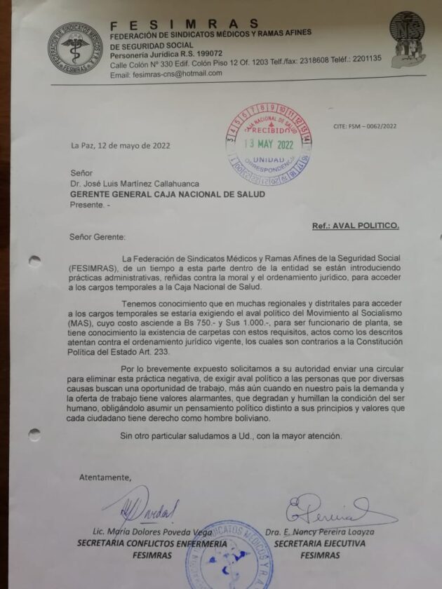 A continuación Sinmordazadigital tienen como prueba la nota enviada por FESIMRAS, dónde acusan claramente a los masistas de supuestos cobros por ingresar a trabajar a la Caja Nacional de Salud y otros aspectos que de inmediato se subordina el Gerente de esta institución y emite el instructivo de los avales.