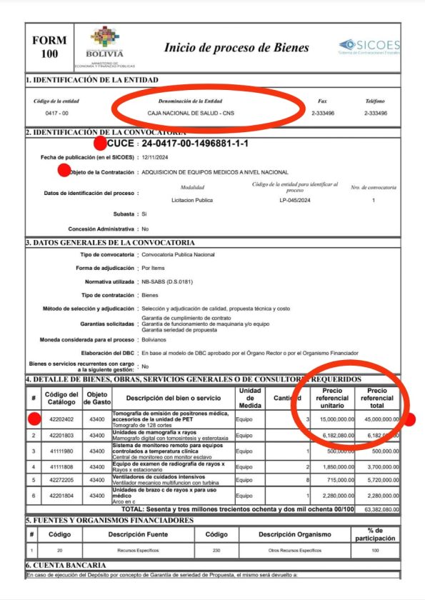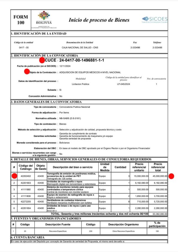 De acuerdo al formulario 100 inicio de proceso de Bienes del Ministerio de Salud y Deportes , modalidad licitación publica ,objeto de contratación adquisición de equipo médicos a nivel nacional ,la Caja Nacional de Salud , pretende adjudicarse acortando los plazos de entrega tomógrafos de 128 cortes , para el hospital materno infantil, cantidad 4 precio referencial unitario de 15.000.000.00 haciendo un precio referencial de 60.000.000.00 , mismo equipo de acuerdo al Ministerio de Salud tiene un costo de 10.500.000 .00 es decir habría un sobreprecio de 20.000.000.00 .