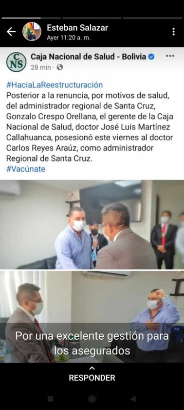 Lunes 20 de junio 2022.- El Gerente General de la Caja Nacional de Salud, José Luis Martínez, apadrinó a un » pitita» que apoyo al régimen de Jeanine Añez, para que ocupe el cargo de Administrador en Santa Cruz de la Sierra y este lunes los trabajadores impidieron el ingresos a sus oficinas .