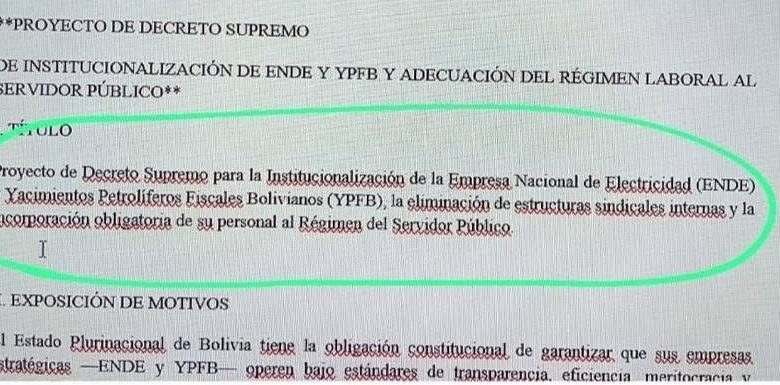 21 de noviembre 2025 .- En las últimas horas trabajadores de todas las filiales de ENDE y YPFB en emergencia ante un Proyecto de Decreto Supremo destinado a modificar el régimen laboral de ambas empresas estratégicas. Según los trabajadores de base, el objetivo central es retirar a todo el personal de la protección de la Ley General del Trabajo para incorporarlo al Régimen del Servidor Público, lo que implica la eliminación de las estructuras sindicales, la pérdida de estabilidad laboral.