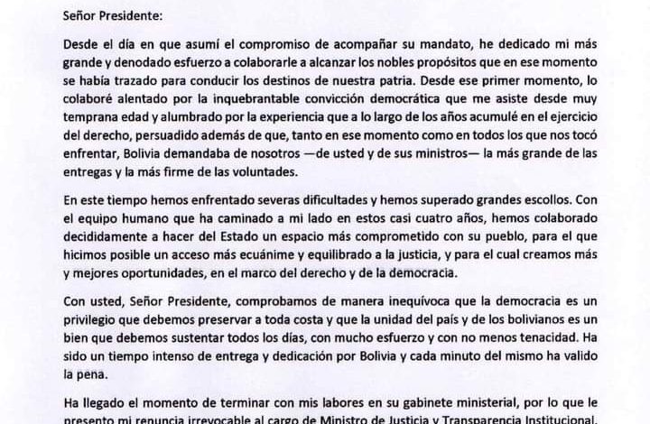 carta de renuncia del Ministro de Justicia, Iván lima con lo qué oficializa qué dejá el cargó dimisión que habría aceptado el presidente Luis Arce Catacora.