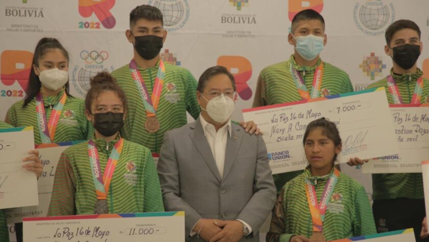 La Paz, 16 may (UC/MSyD).- El presidente Luis Arce Catacora retribuyó este lunes con incentivos económicos valuados en 101.000 bolivianos a los 11 jóvenes deportistas entre 14 y 18 años que obtuvieron medallas en los III Juegos Suramericanos de la Juventud realizado en Rosario-Argentina 2022 en pasadas semanas y comprometió seguir con el apoyo del Gobierno para que se continúen cosechando lauros para el país.