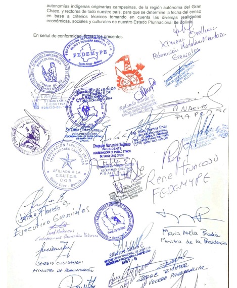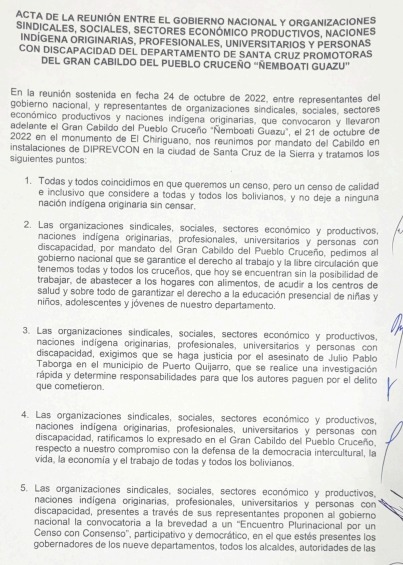 Santa Cruz de la Sierra 24 de octubre 2022 .- El acta firmado entre el Gobierno Nacional y Organizaciones Sindicales, Sociales ,sectores económico productivos ,Naciones Indígenas Originarias ,profesionales, universitarios y personas con discapacidad , del Departamento de Santa Cruz ,consta de cinco puntos en la que se propone al Gobierno Nacional la convocatoria a la brevedad a un ´´Encuentro Plurinacional por un Censo con Consenso´´, participativo y democrático.