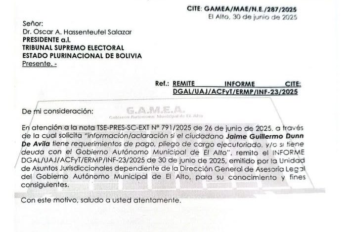 Lunes 30 de junio 2025 .- La alcaldía de El Alto, a través de un informe firmado por la alcaldesa Eva Copa, confirmó este lunes que Jaime Dunn tiene «sentencias y pliegos ejecutoriados en su contra». Esta situación podría impedir su habilitación como candidato en las elecciones generales del 17 de agosto.