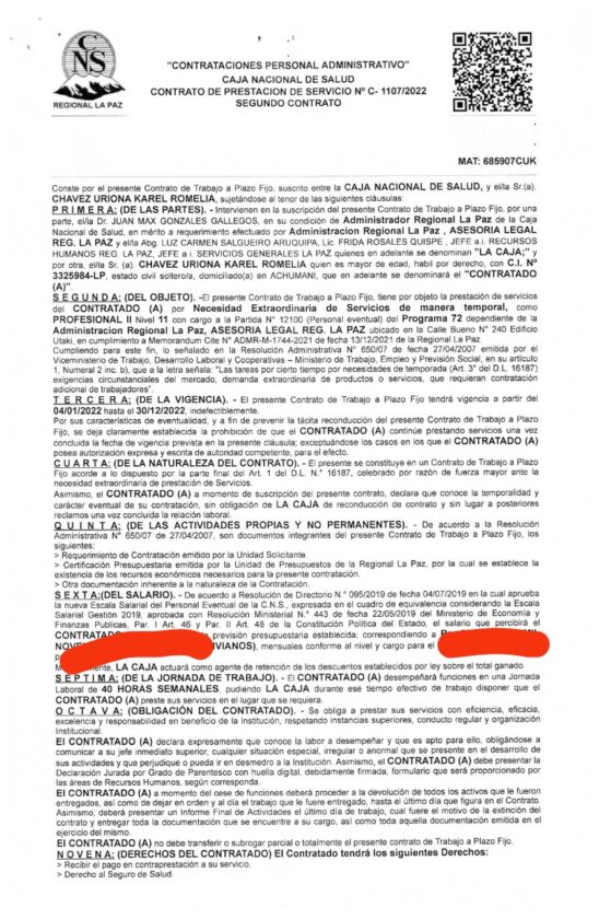Domingo 15 de mayo 2022 .-Karel Chávez Uriona que denunció proceso penal a Evo y Lucho Arce desde la procuraduría cuando trabajaba en el régimen de Jeanine Añez . Ahora trabaja como Asesora Legal de la Regional La Paz , de la Caja Nacional de Salud , de acuerdo al contrato de trabajo que accedió Sinmordazadigital.