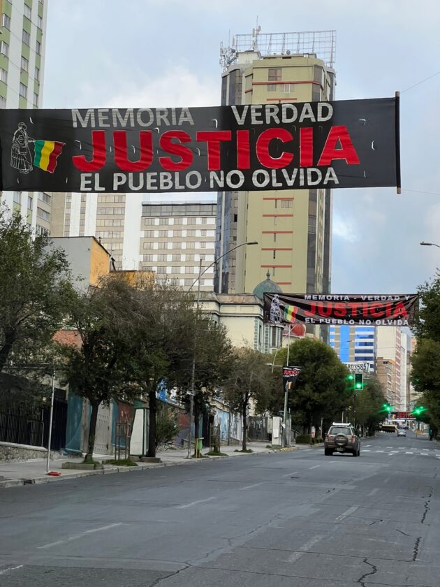 Domingo 22 de enero 2023.- En diferentes calles y avenidas de la ciudad de La Paz y El Alto, se colocaron pasacalles de verdad y justicia bajo el lema » el pueblo no olvida».