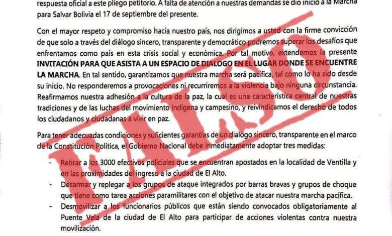 sábado 21 de septiembre 2024.- El Secretario Ejecutivo de la Confederación Sindical de Comunidades Interculturales de Bolivia, Esteban Alavi , dijo Esta carta enviada por los marchistas a dialogar con el presidente Luis Arce Catacora en la marcha , no tiene ninguna legitimidad, por que los dirigentes firmantes no tiene ninguna representación, empezando de Evo Morale, que su gestión como Presidente del MAS IPSP ya culminó hace más de 3 años, los demás dirigentes son nombrados a dedo para precisamente defender los intereses políticos de Evo Morales.
