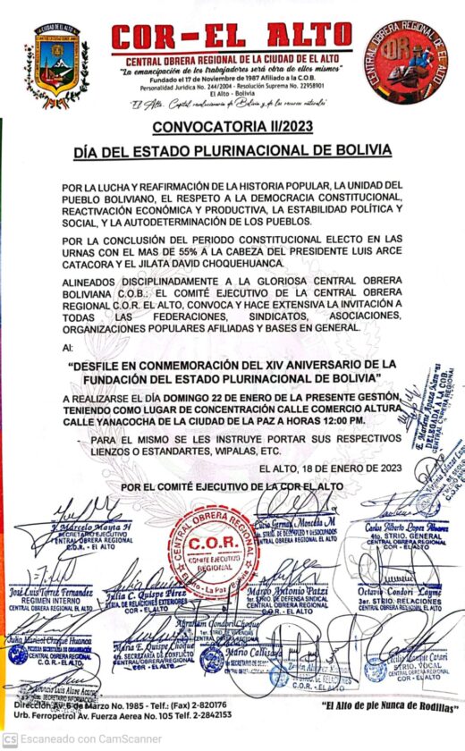 sinmordaza digital 19 de enero 2023.- La principal organización social de la urbe alteña que es la Central Obrera Regional de El Alto, esta convocando a alrededor de 50 sectores sociales como gremialistas, juntas vecinales , padres de familia, y otros sectores a participar de los actos en conmemoración al Día del Estado Plurinacional este domingo 22 de enero en plaza murillo, junto al Presidente Luis Arce Catacora y Vicepresidente David Choquehuanca .