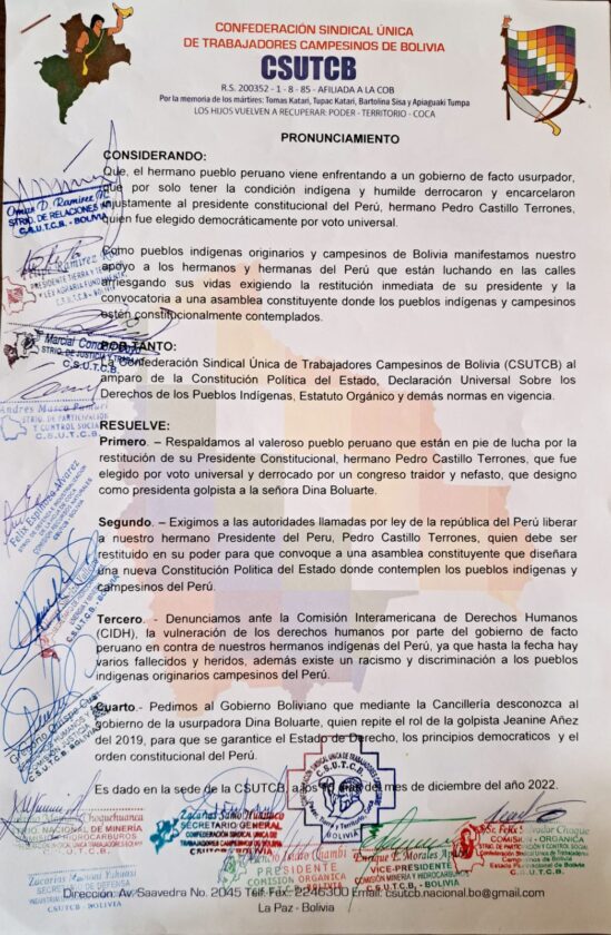 Sinmordaza digital 15 de enero 2023 .- Mediante un pronunciamiento de la Confederación Sindical Única de Trabajadores Campesinos de Bolivia , esta pidiendo al Gobierno Boliviano que mediante la Cancilleria desconozca al gobierno de la usurpadora Dina Boluarte ,quien repite el rol de la golpista Jenanine Añez .