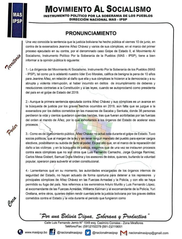 1.- La dirigencia del Movimiento Al Socialismo, Instrumento Por la Soberanía de los Pueblos (MAS – IPSP), tal como ya lo adelantó nuestro líder Evo Morales, califica de benigna la pena de 10 años para Jeanine Áñez, en relación al daño que ella y sus cómplices le hicieron a la democracia y a su abrupta y violenta interrupción, al haber incurrido en delitos de incumplimiento de deberes y resoluciones contrarias a la Constitución y a las leyes, cuando se autoproclamó como presidenta del país en el golpe de Estado del 2019.