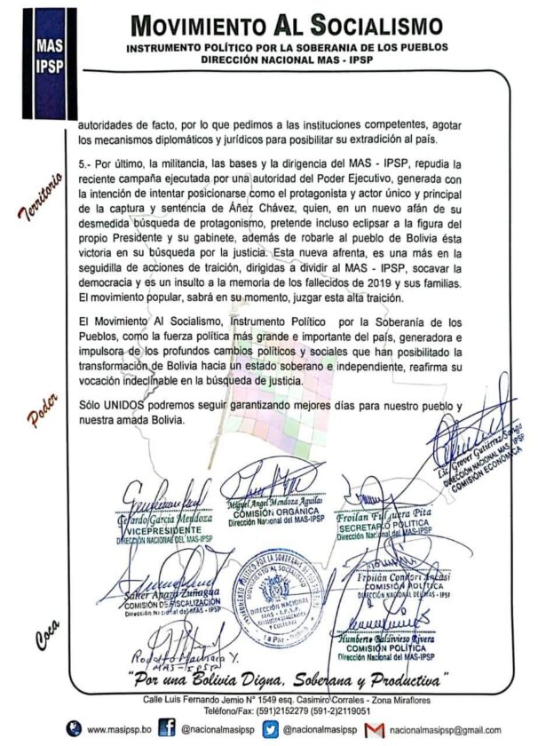 5.- Por último, la militancia, las bases y la dirigencia del MAS – IPSP, repudia la reciente campaña ejecutada por una autoridad del Poder Ejecutivo, generada con la intención de intentar posicionarse como el protagonista y actor único y principal de la captura y sentencia de Áñez Chávez, quien, en un nuevo afán de su desmedida búsqueda de protagonismo, pretende incluso eclipsar a la figura del propio Presidente y su gabinete, además de robarle al pueblo de Bolivia ésta victoria en su búsqueda por la justicia. Esta nueva afrenta, es una más en la seguidilla de acciones de traición, dirigidas a dividir al MAS – IPSP, socavar la democracia y es un insulto a la memoria de los fallecidos de 2019 y sus familias. El movimiento popular, sabrá en su momento, juzgar esta alta traición.