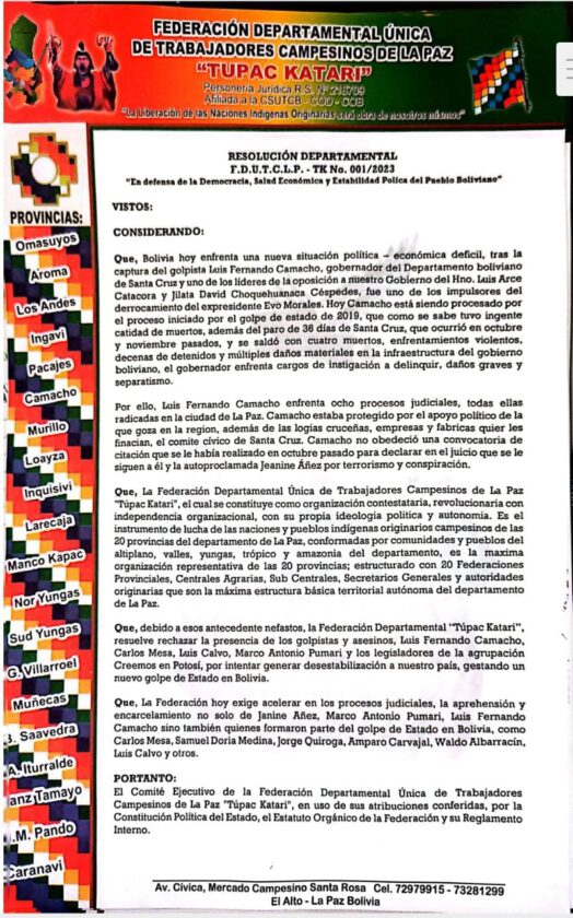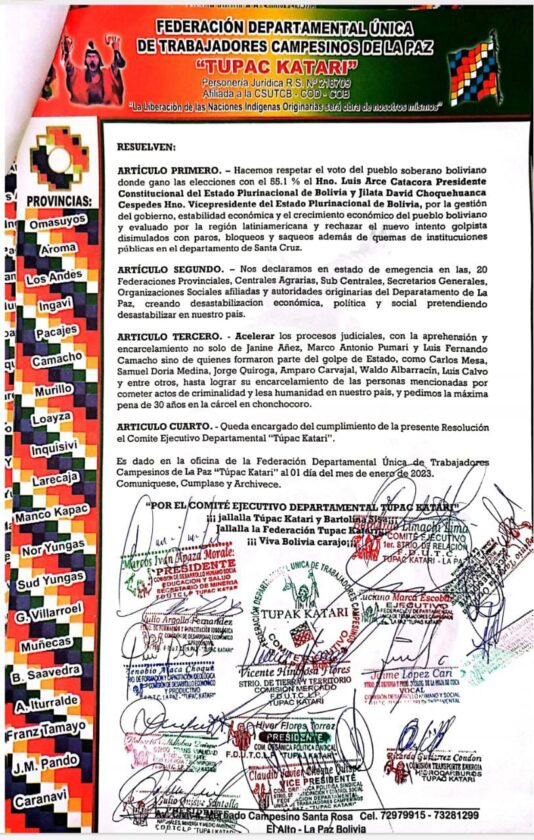sinmordaza digital 06 de enero 2023.- La Federación Sindical de Trabajadores Campesinos del Departamento de La Paz , Tupac Katari, emitió un contundente pronunciamiento en la que se declaran en Estado de Emergencia , ante la actual coyuntura política del país por la aprehensión del Gobernador Luis Fernando Camacho.