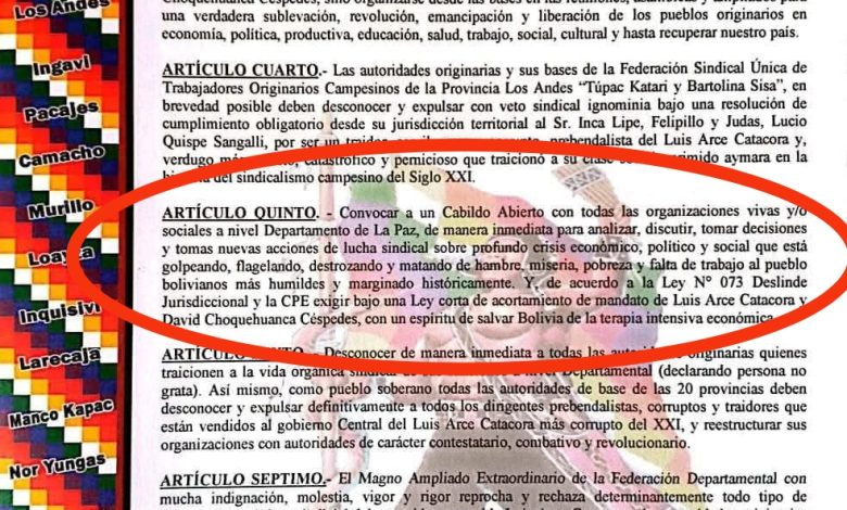 De acuerdo a una resolución de una Federación sindical de trabajadores Campesinos Tupac Katari del Departamento de La Paz, a la cabeza del dirigente desconocido David Mamani, están convocando a una Cabildo Abierto contra el Gobierno y pidiendo el acortamiento de mandato del presidente Luis Arce Catacora, en circunstancias cuando se está cerrando una gestión .