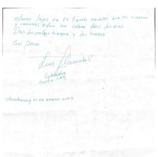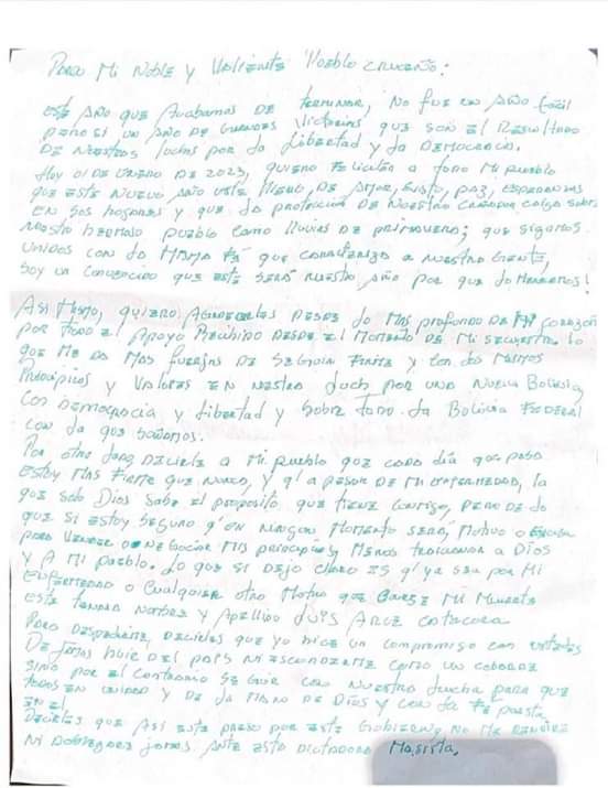Además en la carta Camacho habla de federalismo y que no se doblegará y continuará con su lucha por la democracia prevé que este año nuevo 2023 , será mejor para el pueblo Cruceño .
