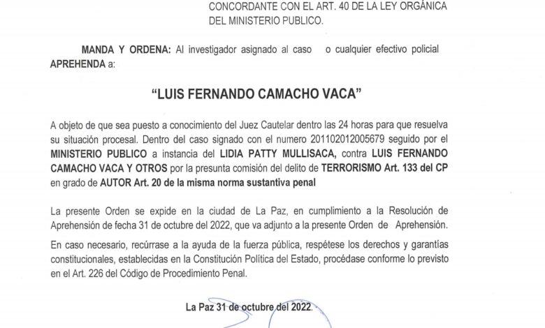28 de diciembre 2022.- este es mandamiento de APREHENSIÓN contra el Gobernador de Santa Cruz de la Sierra, Luis Fernando Camacho, por el caso terrorismo interpuesto por la ex asambleísta Lidia Patty.