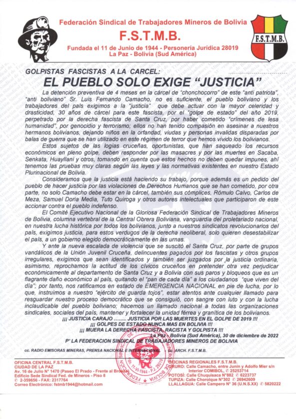 Sinmordaza digital 30 de diciembre 2022.- Mediante un pronunciamiento de la Federación Sindical de Trabajadores Mineros de Bolivia ,el Pueblo solo exige ´´JUSTICIA´´, este sector esta pidiendo 30 años de cárcel para el Gobernador Luis Fernando Camacho , por haber cometido ´´ crímenes de lesa humanidad por genocidio y terrorismo además es un pedido del pueblo puedan ser detenidos sus cómplices Romulo Calvo, Carlos D Mesa , Samuel Doria Medina , Tuto Quiroga y otros considerados autores materiales e intelectuales de los acontecimientos del año 2019 .