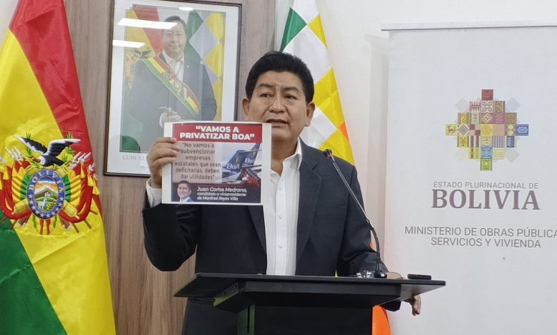 11 de julio 2025 .- El ministro de Obras Públicas, Édgar Montaño, cuestionó las declaraciones del candidato a la vicepresidencia de Manfred Reyes Villa, señalando que “ha dicho que va a privatizar BoA”. Criticó que los candidatos de la derecha “no tienen otra propuesta, su receta es vender todas las empresas públicas”.