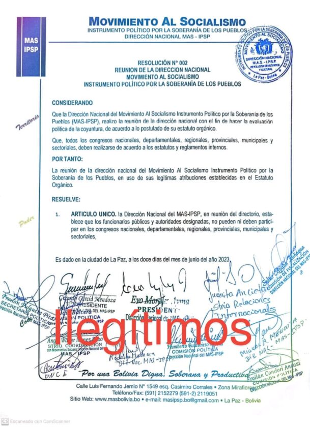 Sin mordaza digital 15 de junio 2023.- Las ultimas resoluciones de la Dirección Nacional del MAS-IPSP, en contra del Presidente Luis Arce Catacora y Vicepresidente David Choquehuanca , pretendiendo que no participen en Congresos a titulo de que son Funcionarios Públicos y lo que es peor promover su expulsión de filas del instrumento político , a causado una reacción de las organizaciones sociales que están cuestionando a los que firman estos pronunciamientos ya que esta cúpula de dirigentes ya no representan a los movimientos sociales .